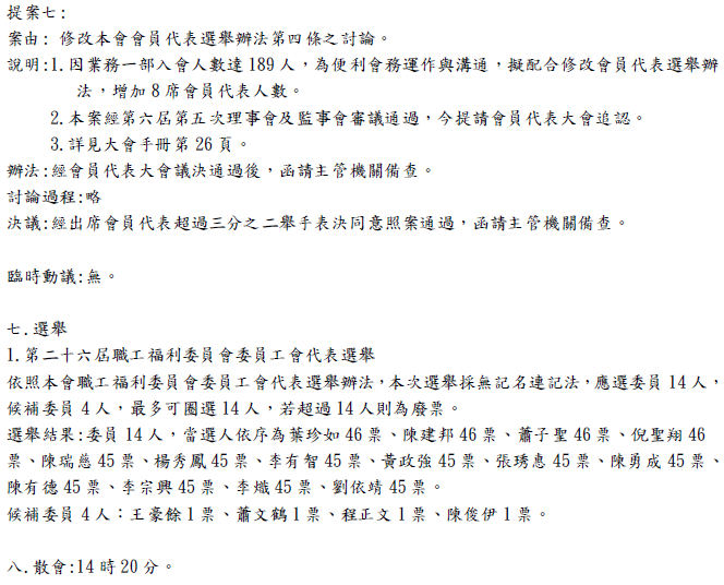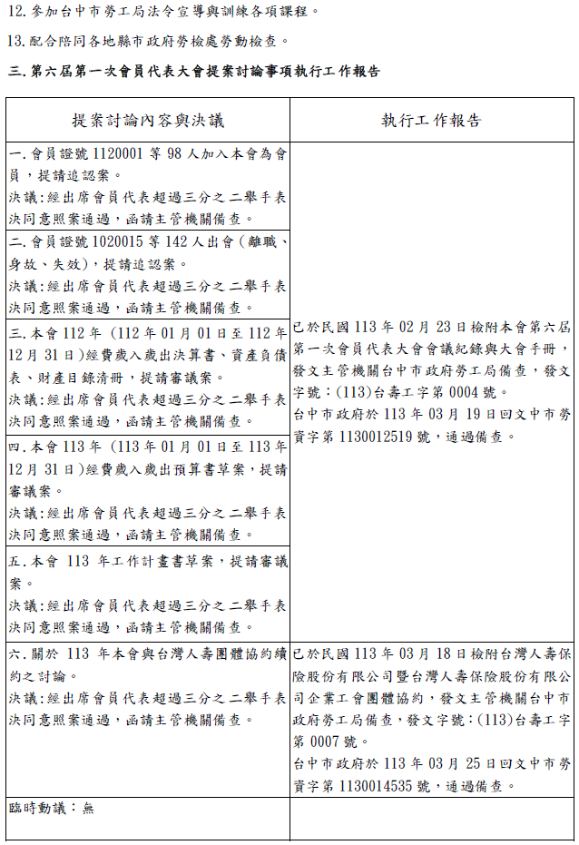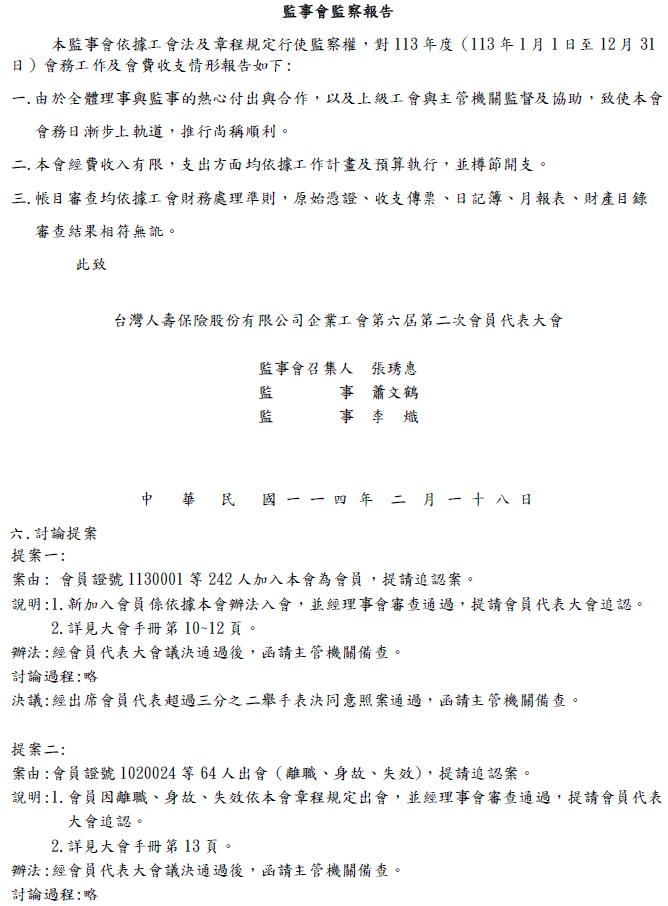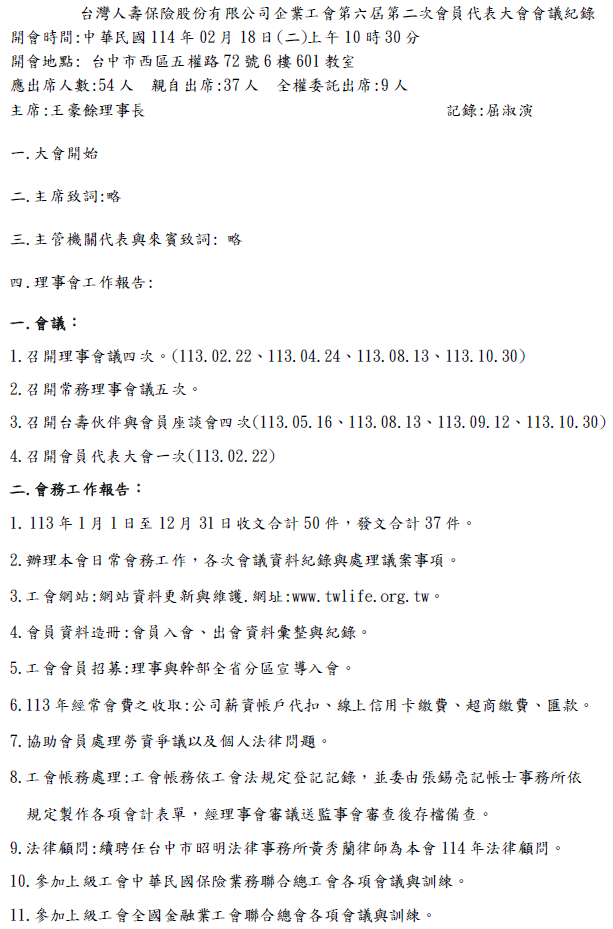 台灣人壽保險股份有限公司企業工會第六屆第二次會員代表大會會議紀錄